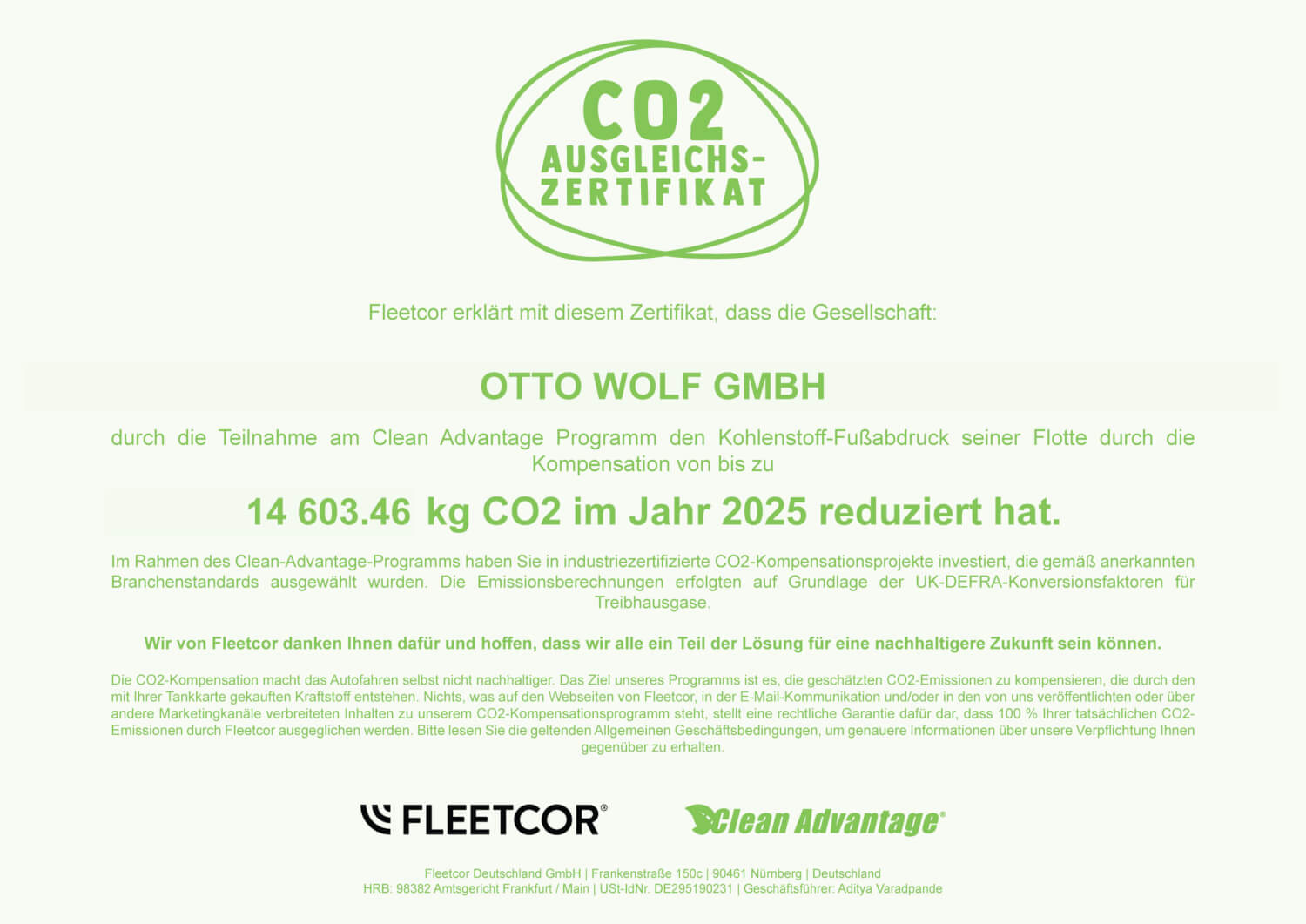 Wir haben uns entschieden, aktiv einen Teil zur Lösung für eine nachhaltigere Zukunft beizutragen. Aus diesem Grund gleichen wir unsere Flotten-Emissionen aus und haben das offizielle CO2 Ausgleichs-Zertifikat erhalten.
